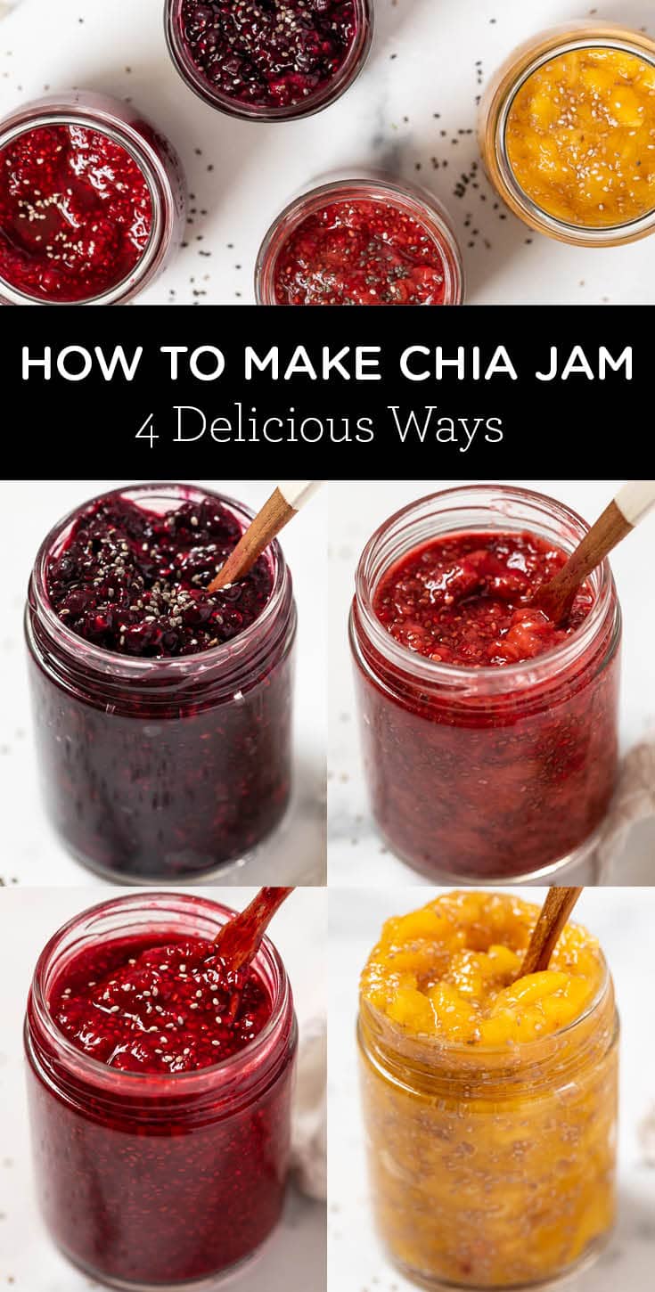 Here's how to make chia seed jam in 4 delicious flavors! This healthy jam is easy to make and can use as few as two ingredients. Tastes just like real jam! Plus we're sharing our favorite flavor ideas: raspberry, blueberry, strawberry, and peach!