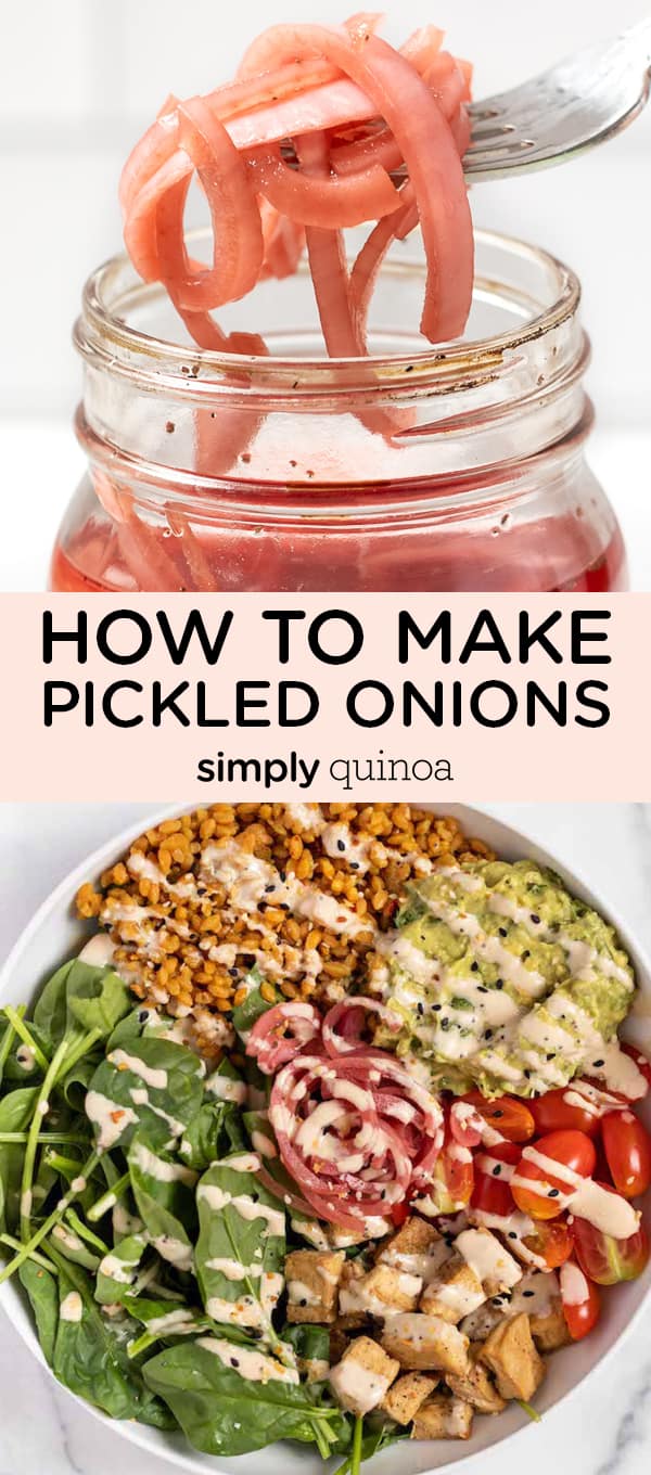 Learn how to make pickled onions, quickly and easily! This super simple recipe takes about 5 minutes and is ready in 10. Use your pickled onions on everything from tacos, salads, bowls, and more!